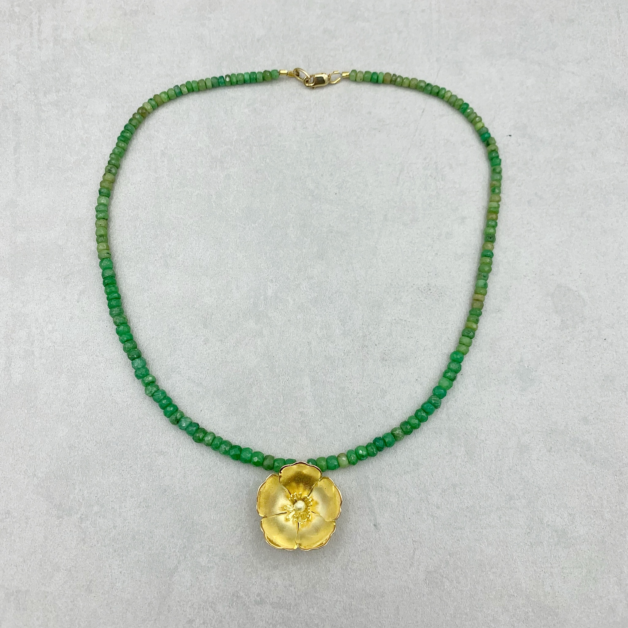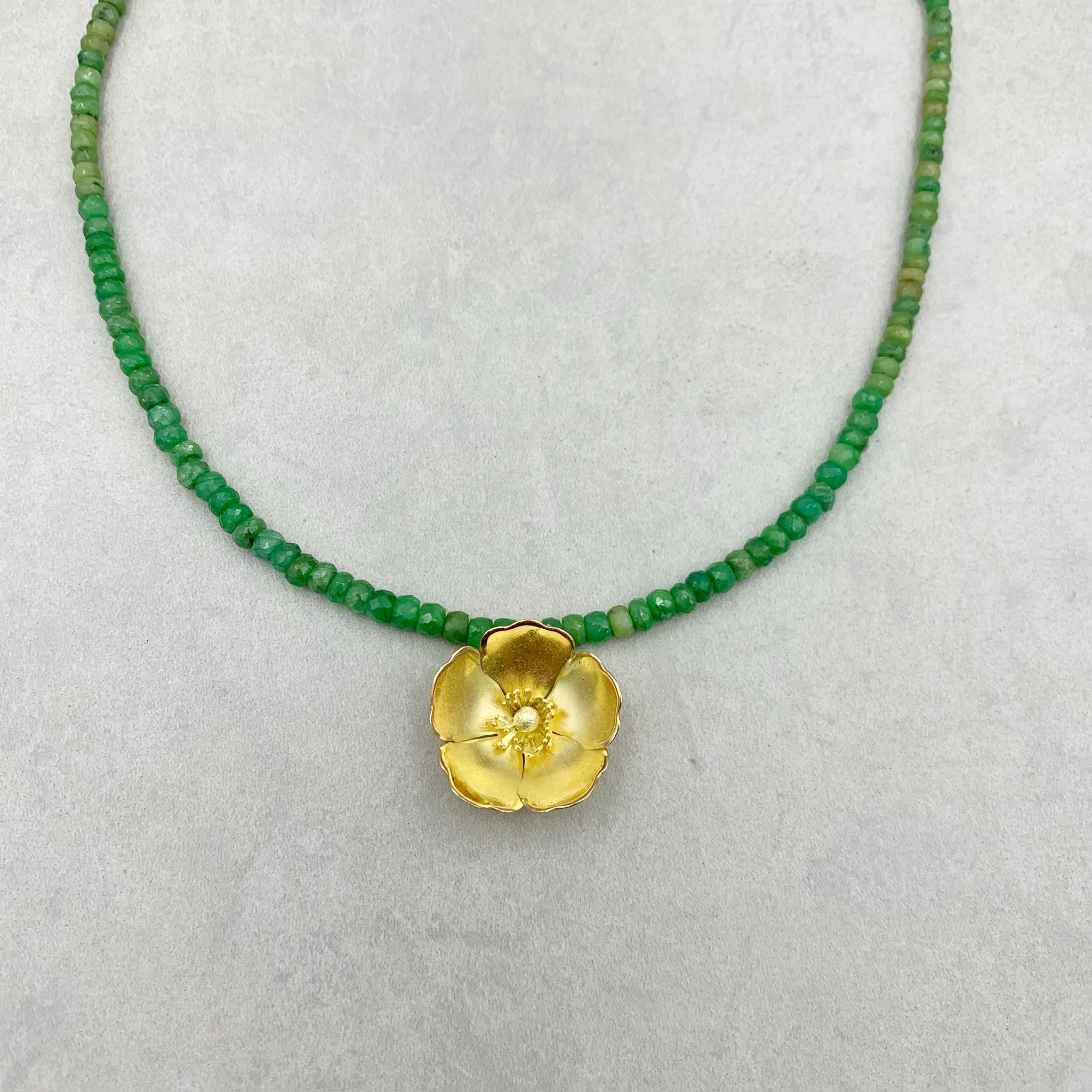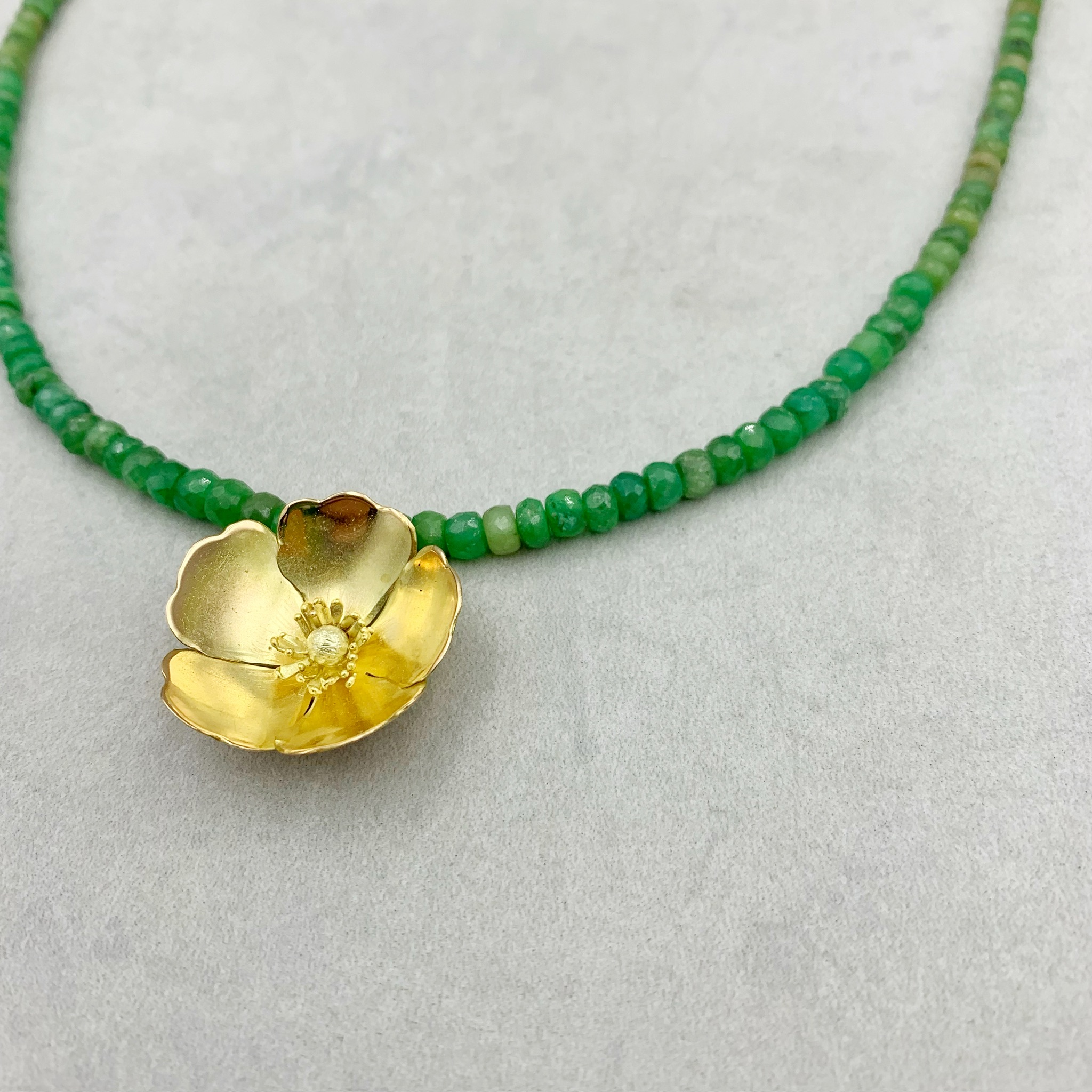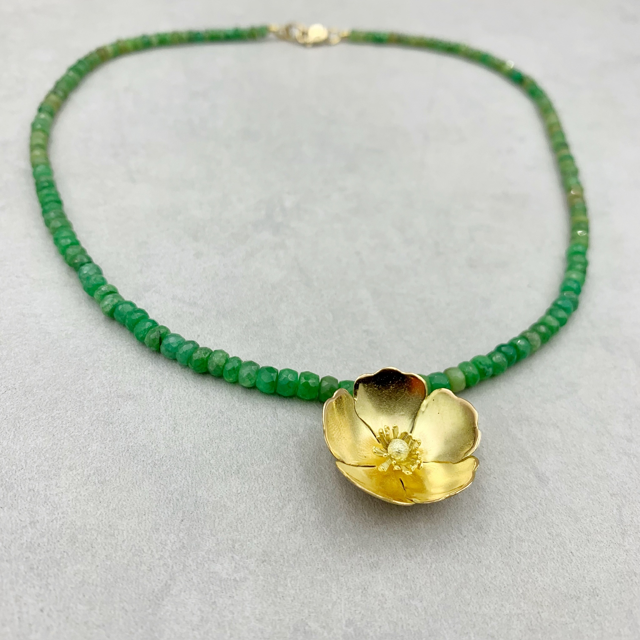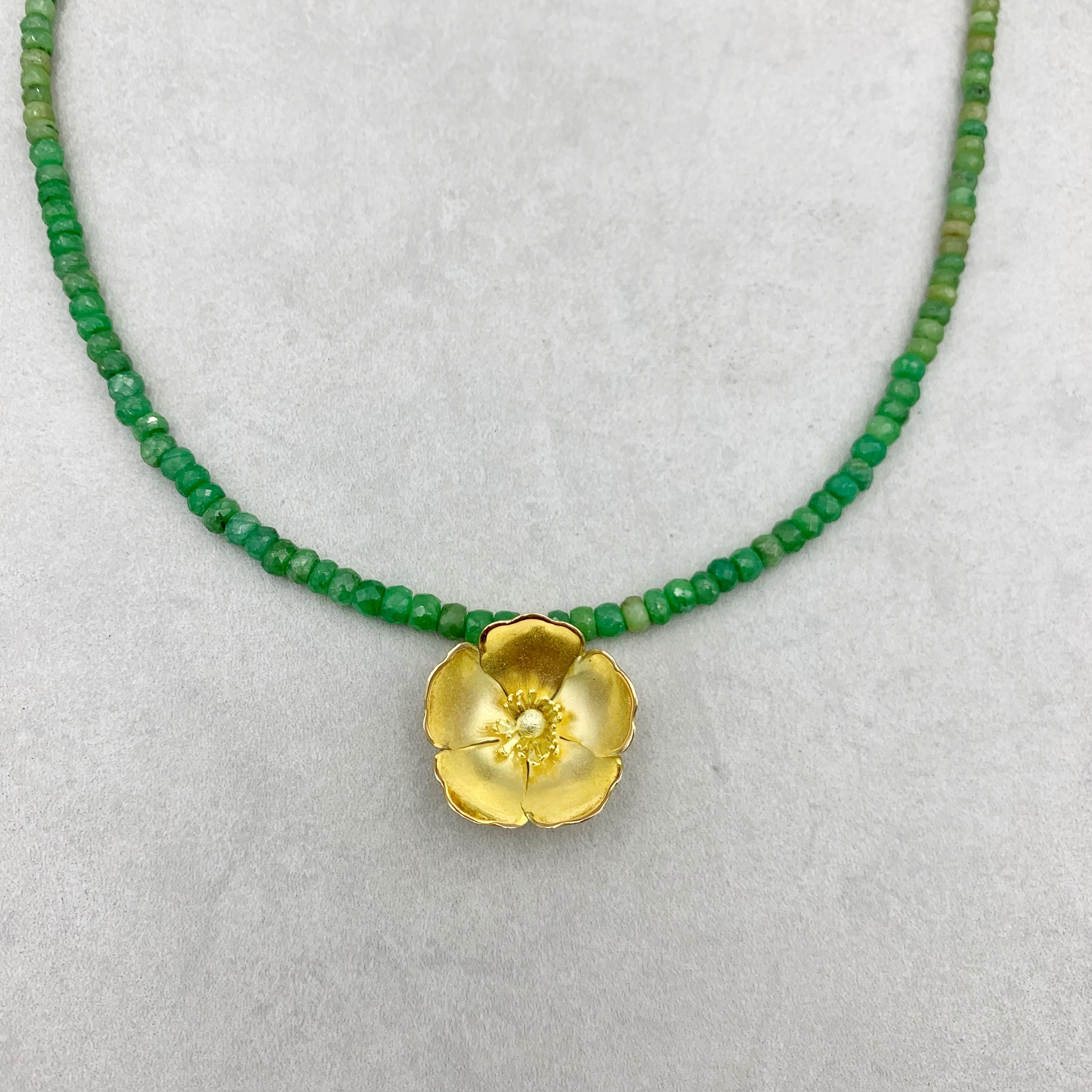 Kombiniert ist die Blüte mit einer Kette aus facettierten Smaragd-Perlen im Größenverlauf, die saftig grün wie eine Alpenwiese strahlt.