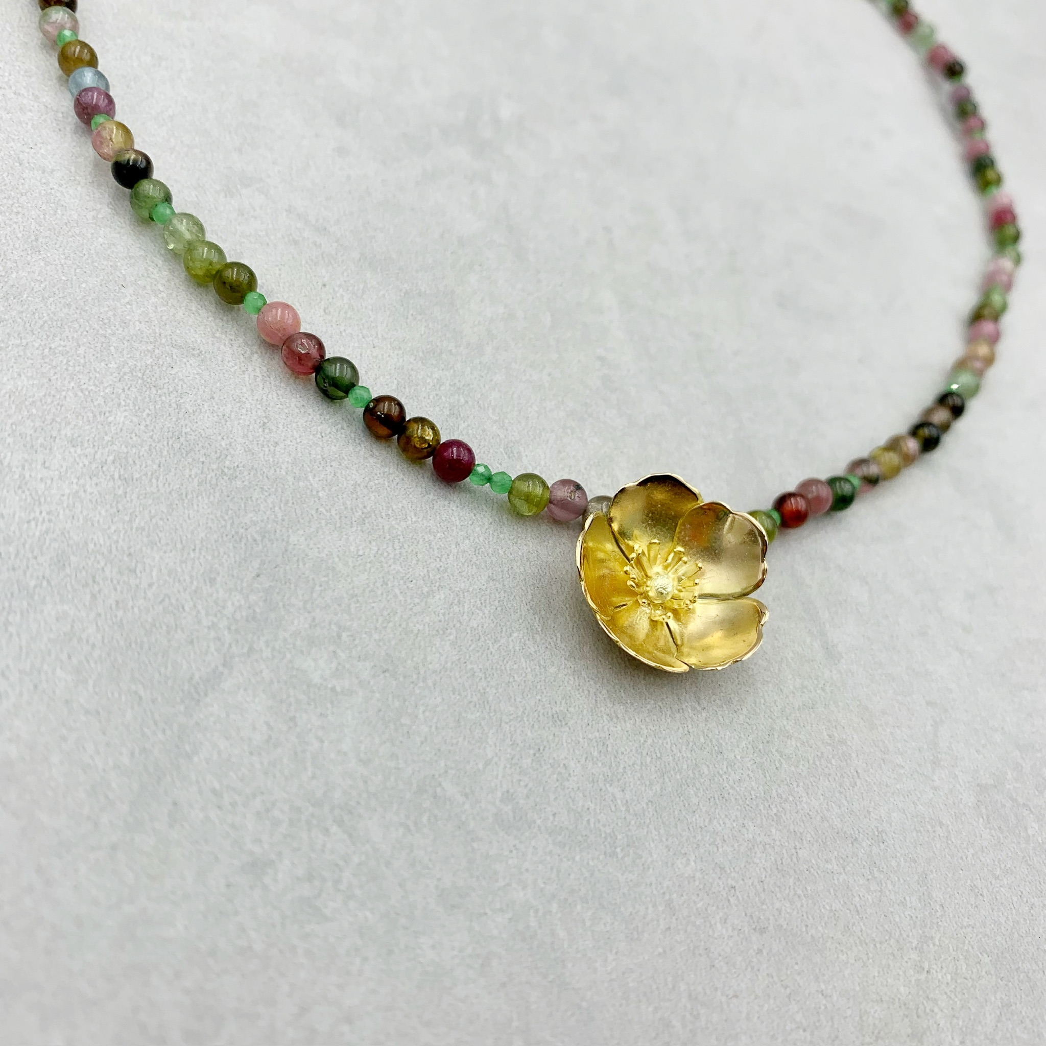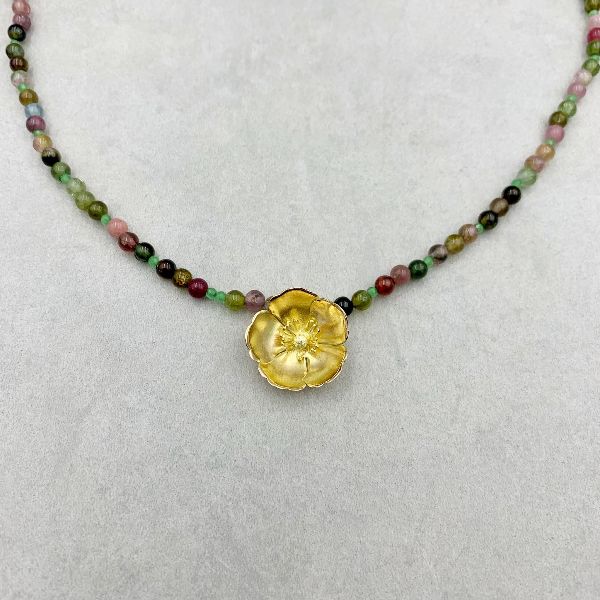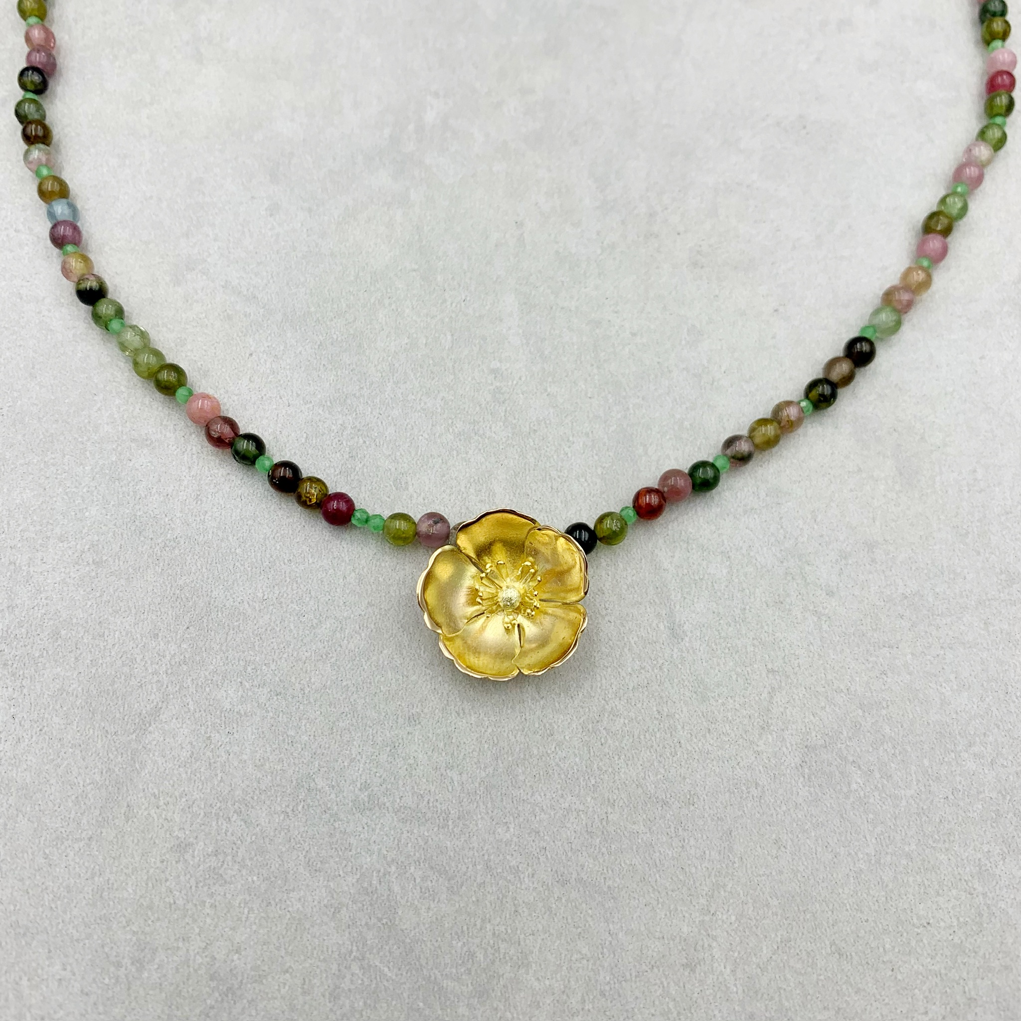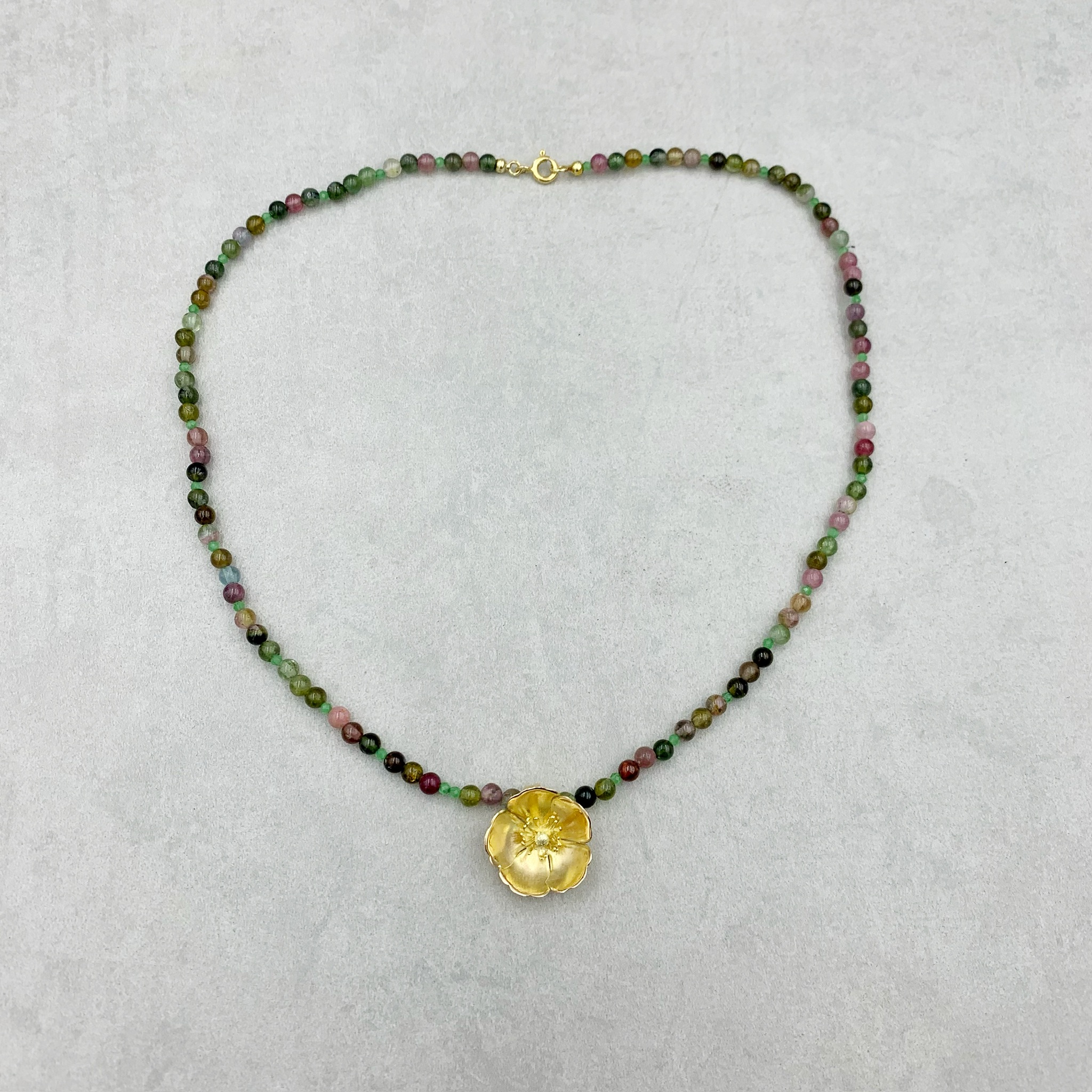 Die Blüte ist kombiniert mit mehrfarbigen Turmalin-Perlen und facettiertem grünen Achat. Die Farben erinnern an die Farben von satten Alpenwiesen im Sommer.