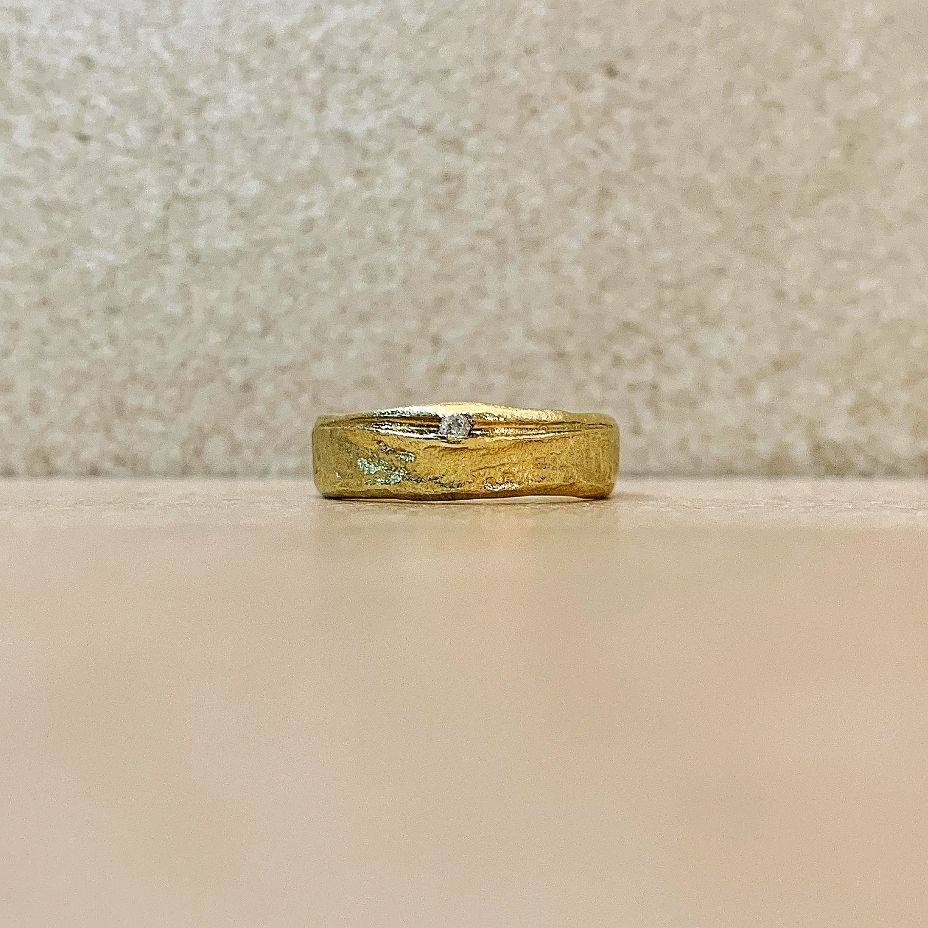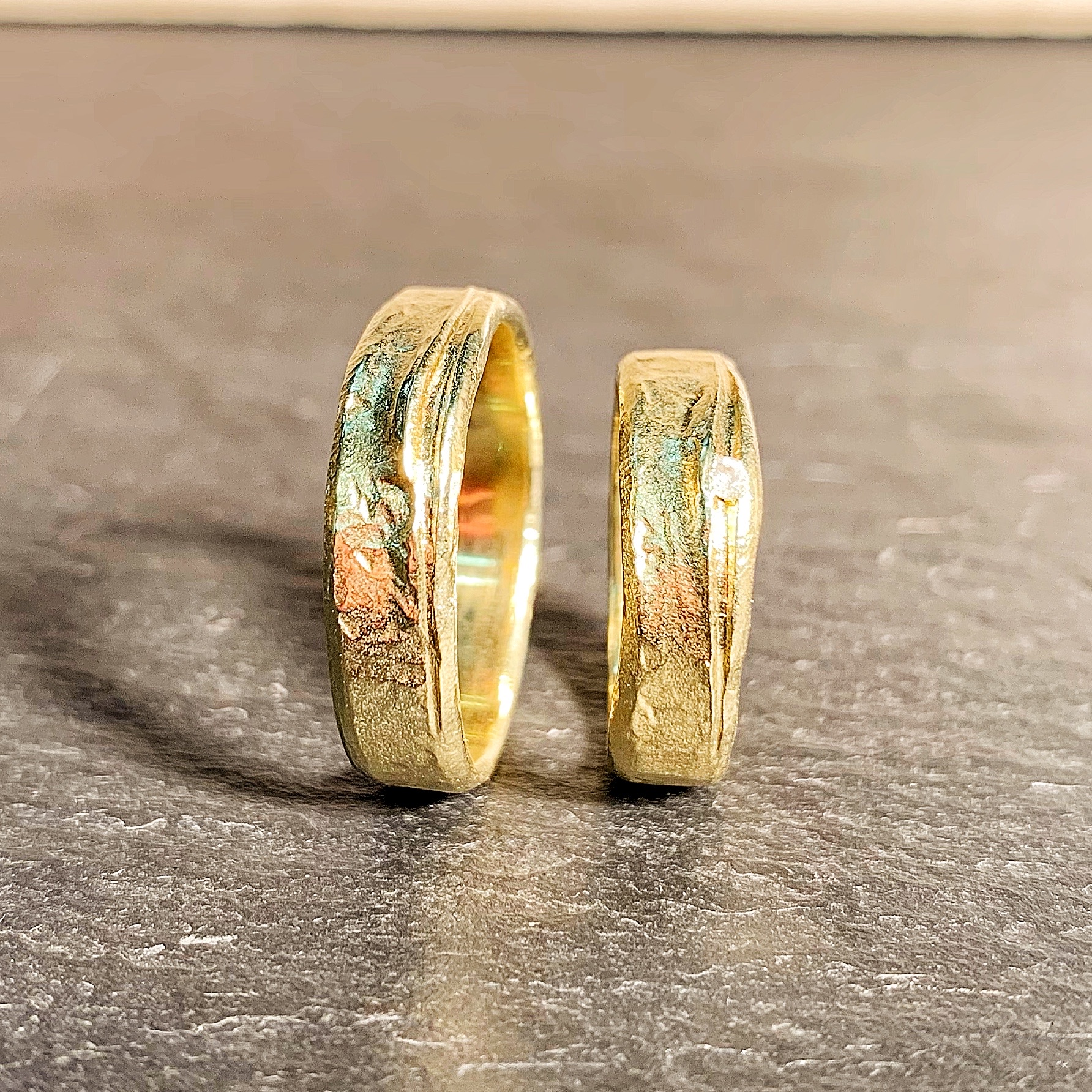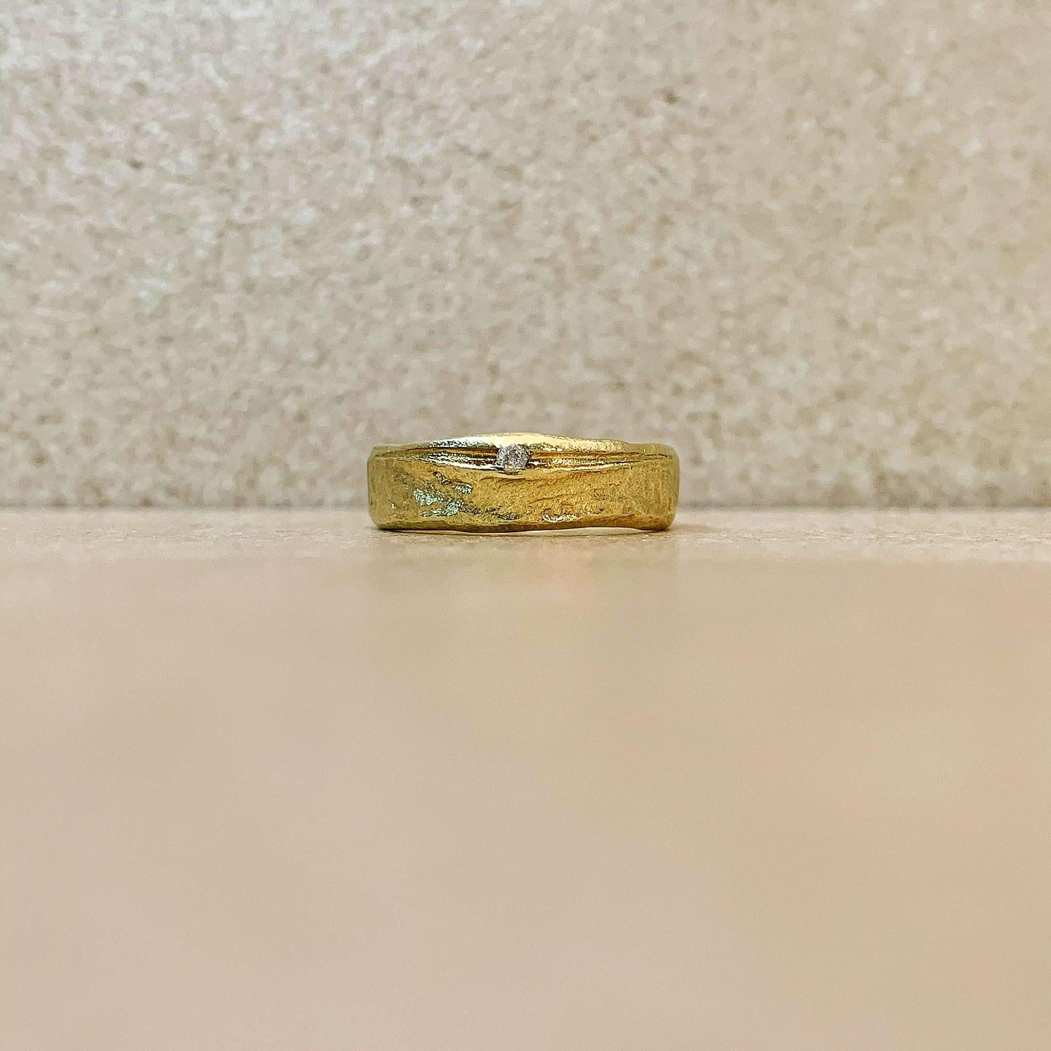 Der Ring wird aus 585/-Gelbgold gefertigt, hat eine strukturierte „felsige“ Oberfläche und als besonderes Stilelement die Felspalte, in die auf Wunsch auch ein kleiner Diamant im Brillantschliff gefasst werden kann.