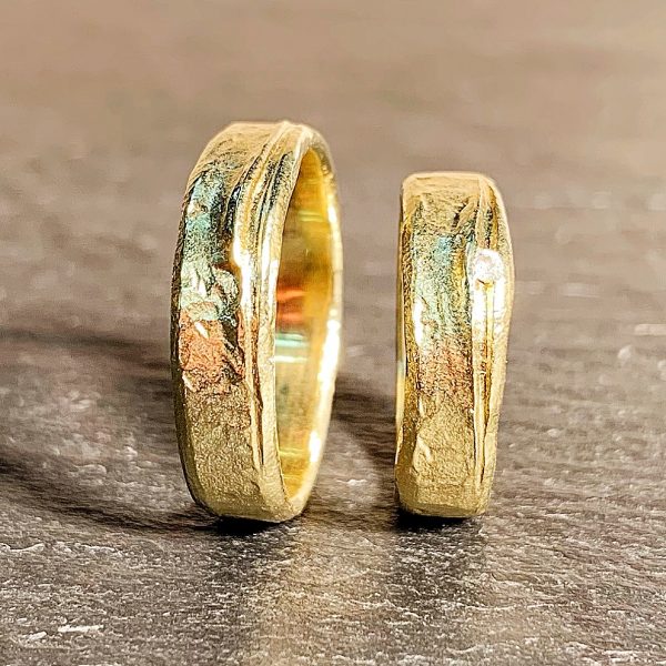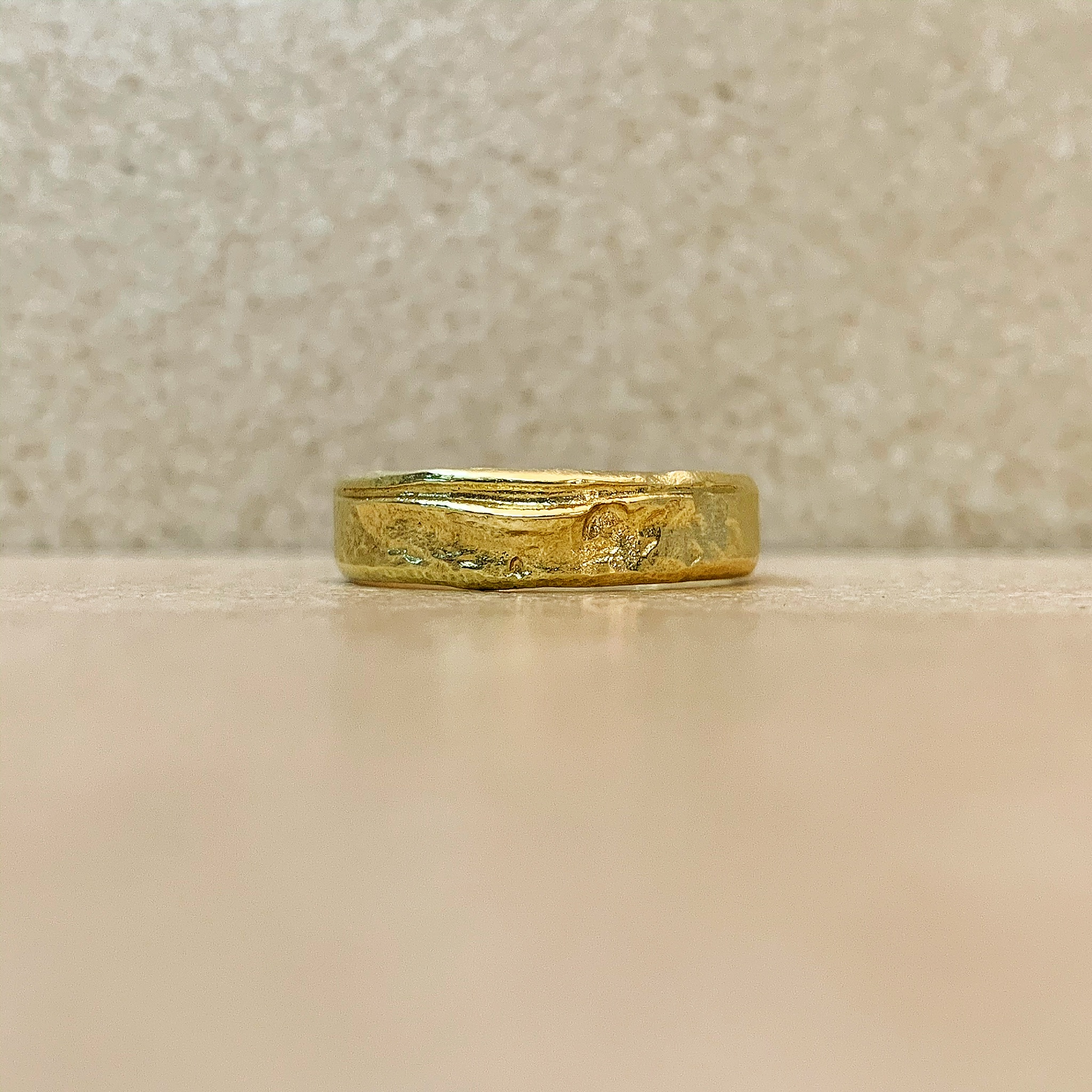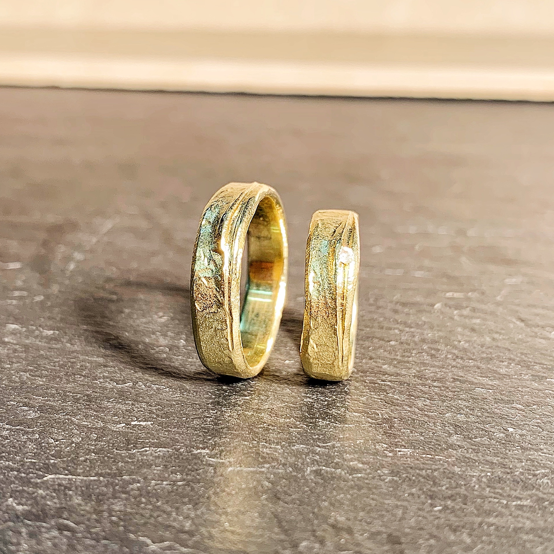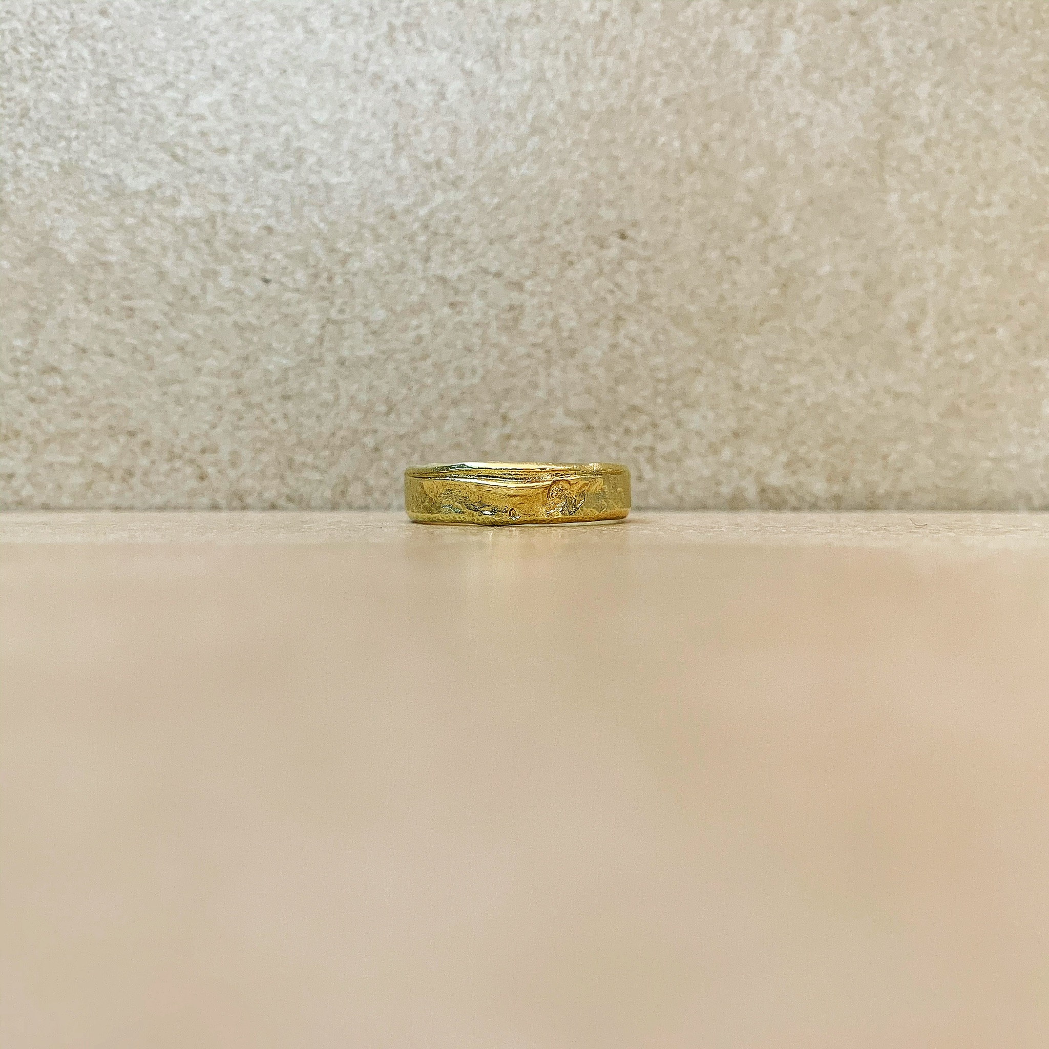 Der Ring wird aus 585/-Gelbgold gefertigt, hat eine strukturierte „felsige“ Oberfläche und als besonderes Stilelement die Felspalte, in die auf Wunsch auch ein kleiner Diamant im Brillantschliff gefasst werden kann.